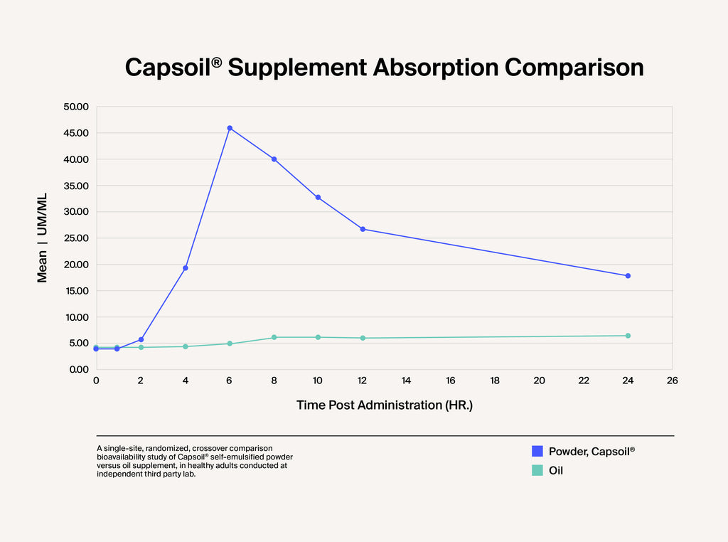 Research shows that the absorption of our Capsoil® supplements are up to 5X greater than that of standard supplements.