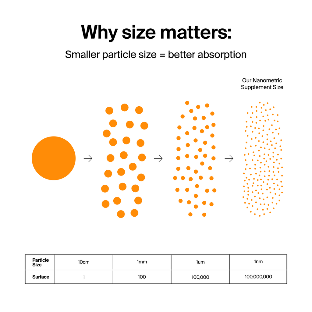 Under our proprietary Capsoil® technology, nutrient particles are reduced to 1/1000 of their size(200 nm). This increases surface area — which increases the ability of your body to absorb it.